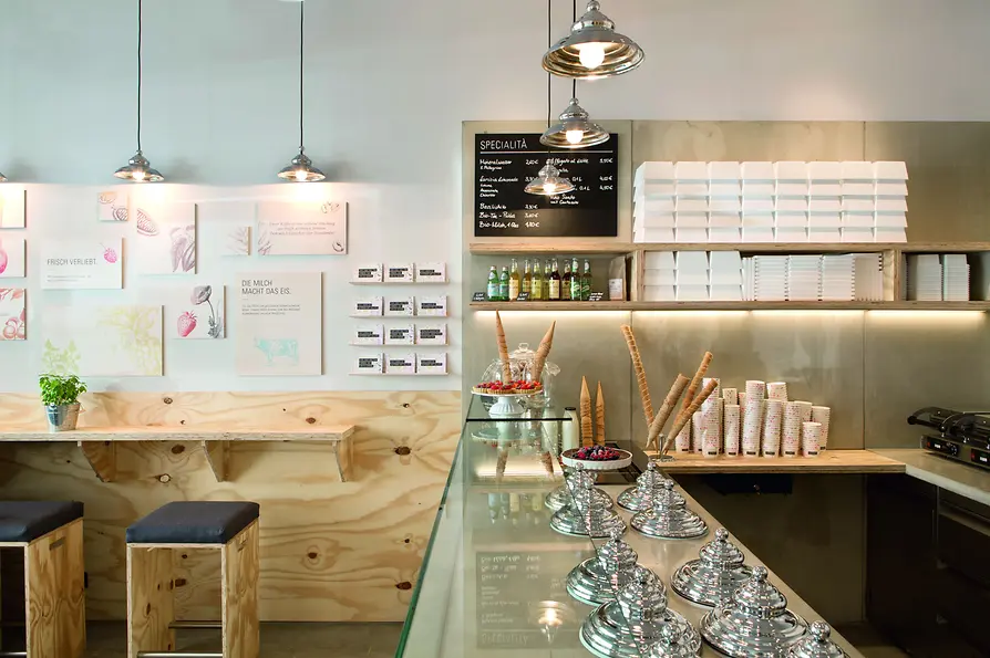 Nenápadné zvenčí, ale poctivé a rafinované uvnitř: Malý salón Eisfuchs překvapuje kreativním výběrem vlastních chutí. Kromě několika stálic se v nabídce pravidelně objevují vzrušující kombinace chutí, jako je vlašský ořech-syrovátka, pomeranč-zázvor nebo nektarinka s zeleným čajem.