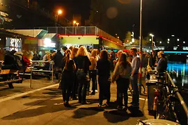 Bei sommerlichen Temperaturen ist nicht nur der Dancefloor bestens gefüllt, auch am Ufer des Donaukanals sitzt man gerne beisammen. Seit einiger Zeit bietet das ausgebaute Flex Cafe einen eigenen, immer gut besuchten Floor.