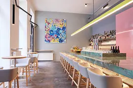 Der Eissalon war tatsächlich einmal ein ehemaliger italienischer Eissalon. Eis gibt es hier auch heute wieder, abends herrscht Barbetrieb mit Cocktails und Weinen. Die Luster Bar ist eine angesagte und immer gut besuchte Cocktail-Bar mit empfehlenswerten Drinks und feinem Bar-Food. Der namensgebende Luster schwebt als eine interessante Regalkonstruktion für die Getränkeflaschen über den Köpfen der Gäste.