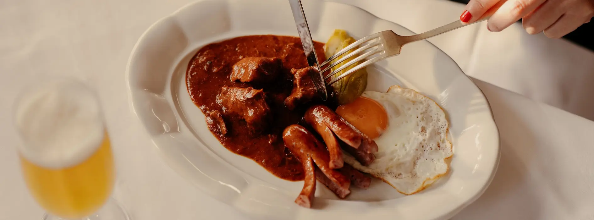 Wenn Sie das Gulasch im Backrohr bei 160 °C garen, so kann sich nichts anlegen und das Fleisch kann bei gleichmäßiger Hitze schön langsam dünsten. Gießen Sie nie zu viel Wasser nach. Sonst schwimmt das Fleisch, wodurch der typische sämige Gulaschsaft nicht entstehen kann. Statt Sacherwürstel kann man selbstverständlich auch Frankfurter Würstel verwenden, und die Spiegeleier können zur Abwechslung auch einmal durch wachsweich gekochte Eier ersetzt werden.