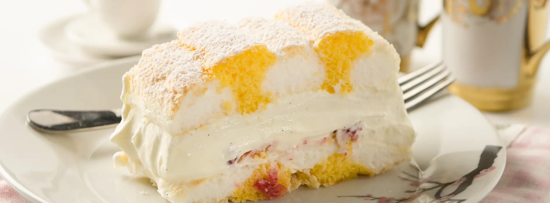 Für die zweite Masse die Eier mit Dottern, Staubzucker und Zitronenschale schaumig rühren und Mehl einmengen. Zwei je 14 x 35 cm große Backpapierstreifen zuschneiden und auf ein Backblech legen. Schnee mit einem Dressiersack mit großer runder Tülle auf jedes Backpapier in je 3 Streifen mit jeweils 2 cm Zwischenraum spritzen. Dottermasse ebenfalls mit Hilfe des Dressiersacks in die Zwischenräume einspritzen und alles dick mit Staubzucker bestreuen. Im vorgeheizten Backrohr bei 180 °C und leicht geöffneter Backofentür backen (die Masse sollte eher trocknen). Abkühlen lassen, auf eine Platte stürzen und Papier abziehen.