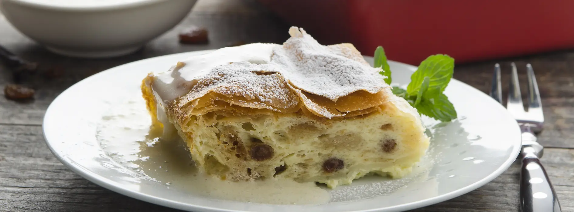 Von der bestrichenen Seite her zu einem Strudel einrollen. Mit der Teignaht nach unten in eine gefettete Form gleiten lassen und mit verschlagenem Dotter bestreichen. Für den Überguss alle Zutaten gründlich verquirlen und ein Drittel davon über den Strudel gießen. Im auf 180 °C vorgeheizten Backrohr 40-50 Minuten backen. Währenddessen immer wieder mit der Milchmischung begießen und mit zerlassener Butter bestreichen. Mit Staubzucker bestreuen und portionieren.