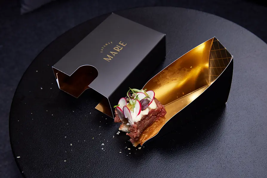 Ein Haubenkoch, ein Bio-Landwirt, ein Creative-Director und ein Top-Gastronom eröffnen ein Lokal. Das ist nicht der Beginn eines schlechten Witzes, sondern der Anfang des innovativen Streetfood-Projekts Tatarie Marie. Diese „Patchworkfamilie der Superlative“, wie die vier sich selbst nennen, belegt Brioche-Brötchen mit rohen Genüssen aller Art: Rind, Kalb, Fisch oder Gemüse – alles aus biologischer Herkunft. Auch die vielen Flavors und Toppings sind ebenso sorgfältig ausgewählt wie angerichtet. Für den Geschmack verantwortlich ist Dominik Stolzer, der zuletzt im Hotel Sacher als Küchenchef tätig war. Alles zusammen ergibt einen Schmaus sowohl für den Gaumen als auch für das Auge. Ein weiterer Blickfang sind die leuchtenden, 3D-gedruckten Stiernasen im Schaufenster des kleinen Lokals hinter dem Stephansdom. Die Tatarie Marie bringt Fast Food somit in allen Bereichen auf das nächste Level und beweist, dass schnelles Essen einerseits gut schmecken und andererseits hochwertig und nachhaltig sein kann.