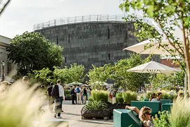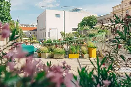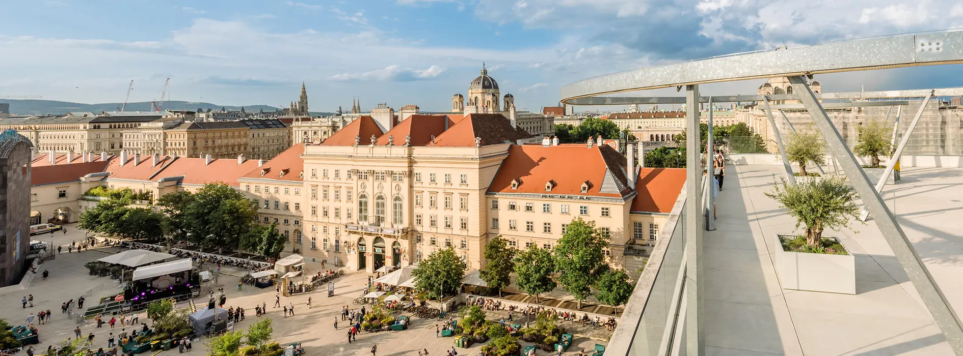 Das MusuemsQuartier, unmittelbar am Rand des 1. Bezirks gelegen und von gleich zwei U-Bahn-Stationen bedient, ist ein pulsierendes, weltoffenes und zukunftsorientiertes Areal, das von den Bewohner:innen und Besucher:innen Wiens gleichermaßen geliebt wird. Es ist rund um die Uhr bei freiem Eintritt zugänglich. Auf den knallbunten, ikonischen MQ-Möbeln (den "Enzis"), die während der warmen Jahreszeit aufgestellt werden, lässt es sich wunderbar entspannen. Speis und Trank werden in den unzähligen Gastronomie-Betrieben im MuseumsQuartier serviert. Den besten Blick auf das Areal und darüber hinaus genießt man von der Aussichtsplattform "MQ Libelle" auf dem Dach des Leopold Museums.