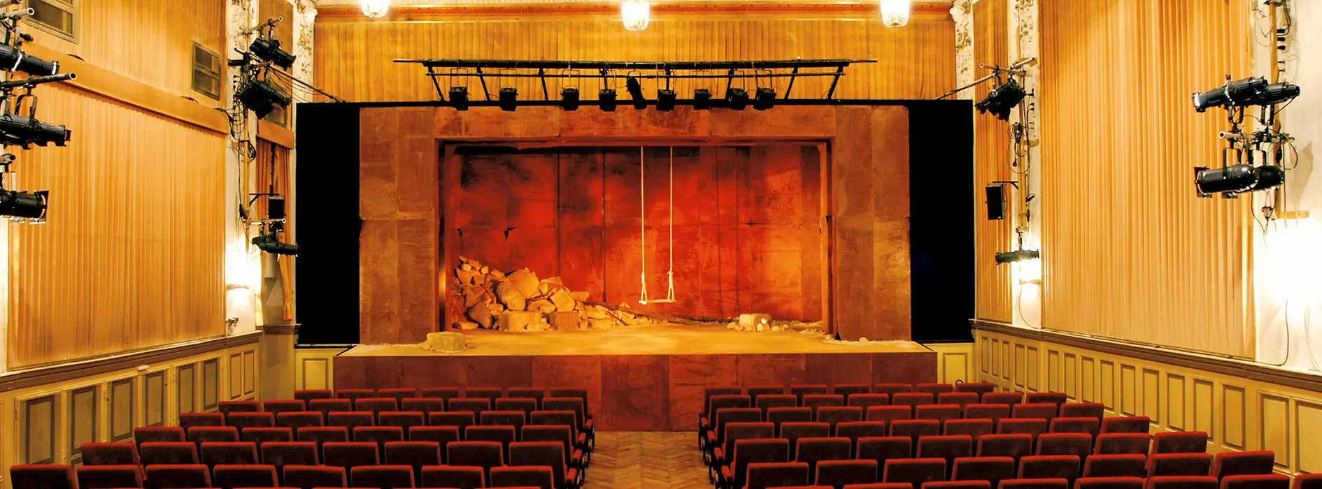 Der Theatersaal aus der Zeit kurz nach 1900 im Stil des Neobarock fasst mit 250 Plätzen ein zahlenmäßig überschaubares Publikum. Der unschlagbare Vorteil solcher kleinerer Aufführungsstätten: Die unmittelbare Nähe zwischen Darsteller:innen und Besucher:innen und damit ein umso packenderes Aufführungserlebnis.