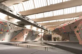 Im Gegensatz zu vielen in Kellern befindlichen „Kletterhöhlen" punktet die Boulderbar Vienna mit hellem, luftigem Ambiente. In der supermarktgroßen Halle mit Oberlichtern wurde früher die Post sortiert - heute tüfteln Boulderer auf ca 1.300m² ihre Routen aus.
