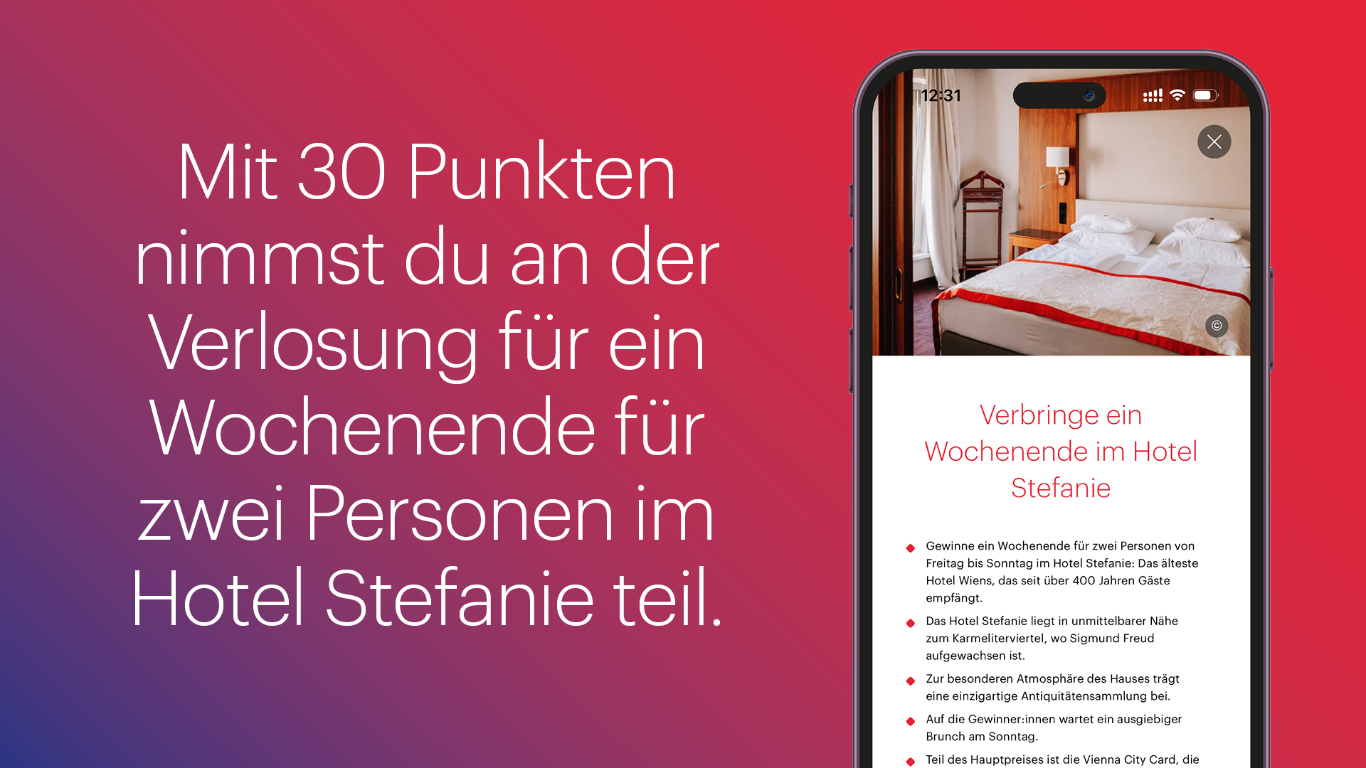 Um dich für die Verlosung des Hauptgewinns zu qualifizieren (ein Luxuswochenende in Wien für zwei Personen im Hotel Stefanie von Freitag bis Sonntag), benötigst du die volle Punkteanzahl von 30 Punkten.