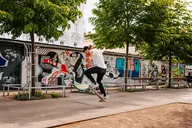 Ich spaziere am Mani vorbei, wo die Küche des Nahen Ostens modern interpretiert wird, und bei Sanny & Michi, einem jungen Wiener Beisl. In der Mitte des Yppenplatzes sind die Wände großflächig mit bunten Graffitis übersät, die durchaus sehenswert sind. Im Sommer sitzen hier die Bewohner:innen der angrenzenden Häuser auf den Bänken und suchen Erfrischung unter den Schatten spendenden Bäumen. Untermalt vom unverkennbaren Geräusch der Basketbälle aus einem der Ballkäfige, wie in Wien die eingezäunten Sportplätze heißen.