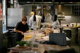 In der offenen Küche bei Mraz und Sohn herrscht bereits zu Mittag Hochbetrieb. Dabei öffnet das Restaurant in der Wallensteinstraße im 20. Bezirk erst abends. Lukas schlendert gelassen von Station zu Station und beobachtet die Vorbereitungen. Yules staunt nicht schlecht, dass es hier so ruhig und gemächlich zugeht. In der Sterneküche hätte sie mit einem raueren Umgangston gerechnet. Da tappt sie in die Vorurteilsfalle. Hier müssen die Gäste quasi durch die Küche durch, um an ihre Tische zu kommen. Als Deko hängt eine "God save the Team"-Fahne im Eingangsbereich. Gutes Essen kocht man eben am besten als Team.