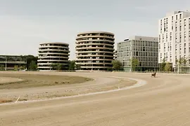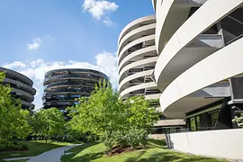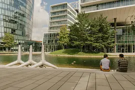 Mitverantwortlich dafür war das bis ins kleinste Detail durchdachte Konzept: Auf 160.000 Quadratmetern sorgen 13.000 Quadratmeter Grünflächen, ein See, ein Springbrunnen, drei Kindergärten, eine Schule, zukünftig zwei Hotels und ein Student:innen-Wohnheim sowie zahlreiche Gastronomieangebote für den Wohlfühlfaktor. Attraktiv für Unternehmen, aber auch für Bewohner:innen und für Gäste, die das Viertel einmal besuchen und immer wieder kommen wollen. Bis 2026 wird weiter gebaut, der Komplex wird noch um ein Wohnhaus, ein Bürogebäude und eine Volksschule erweitert. Dann sollen hier 15.000 Menschen leben und arbeiten – in städtebaulicher Perfektion.