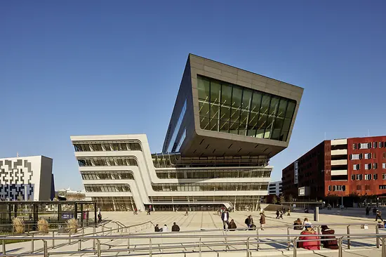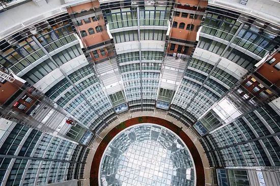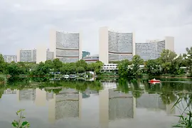 Six Y-shaped office towers are arranged in pairs around a cylindrical conference building in a clever configuration that more or less stops the buildings from blocking the sunlight from one another. This ingenious ensemble was created by the Austrian architect Johann Staber, who in 1968 won an international architectural competition to design what would be the United Nation’s third headquarters. Since their completion in 1979, the 127-meter-high towers have been glinting silver in the daylight, with their bold orange accents echoing the fashion of a bygone era. Anyone who enters the Vienna International Centre will not only be taking an architectural journey back in time, but also leaving Austrian territory: like the other three sites in New York, Geneva and Nairobi, the VIC is located on inviolable international territory belonging to the 193 member states.