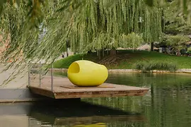 Well-thought-out details jump out at me everywhere I turn: the green areas are laid out around the 5,000 square meter lake, with year-round seating positioned under trees and on the grass. Overlooking the water, naturally. And a dressing table, which stands in the middle of the lake. This is part of the sculpture park. A larger-than-life sign saying Total Living is another of the art installations found in the area.