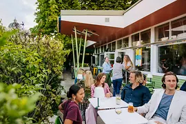 The third area is the former Corti Café, the hall of columns mentioned above. This part was once dubbed The Banana by locals due to its semicircular lines. Haerdtl also designed the gardens that went with it. Though new, it is clear that the perforated metal pattern in the entrance area references the 1950s table lamps in the outdoor seating area. For decades, the hall of columns hosted ballroom dancing events before eventually evolving into a separate night club. TV chef Alexander Kumptner operates a pizzeria here by day, with the space only segueing into a club venue later at night.