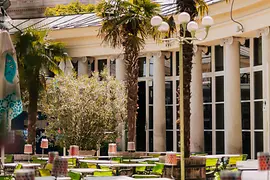 After the second world war, the architect Oswald Haerdtl (1899–1959) transformed the heavily bomb-damaged Corti Café into a popular Tanzcafé or dance café – and it looks largely the same to this day. Haerdtl, a former student of Josef Hoffmann, is renowned above all for his inimitable 1950s architecture. He also designed Café Prückel on Vienna's Ringstrasse boulevard. Today, what was once the Corti Café is now part of the Volksgarten Club Disco. The building comprises three elements, each with its own character: the typical 1950s design is particularly well-preserved in the Winter Garden. With its palm planters, original 50s furniture, and old chandeliers, it’s the perfect spot for anyone looking to take a break from the dance floor. Visually, the Winter Garden provides an interesting contrast to the perforated metal sheeting found in the disco and entrance area – elements that were added during a more recent renovation.