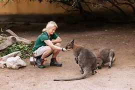 Stanislaus, Viktor and Sam stare at us with sleepy eyes. The three Bennett’s kangaroo joeys at Schönbrunn Zoo are not used to this kind of commotion during their morning feeding session. It is shortly before eight in the morning on a warm August day. Senior keeper Gerlinde Hillebrand has already been on duty tending to her young charges for half an hour. We have the honor of looking over her shoulder as she does her rounds. She knows “her” animals very well: “Stanislaus is sensitive and easily spooked. Sam, though, is the most trusting,” she reveals. Hillebrand and her seven colleagues are responsible for taking care of the dayto- day needs of the kangaroos, koalas, giant pandas, giraffes, ground and southern hornbills, dwarf mongooses, rats, red pandas, frilled-neck lizards and blue-tongued skinks.
