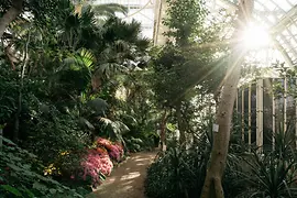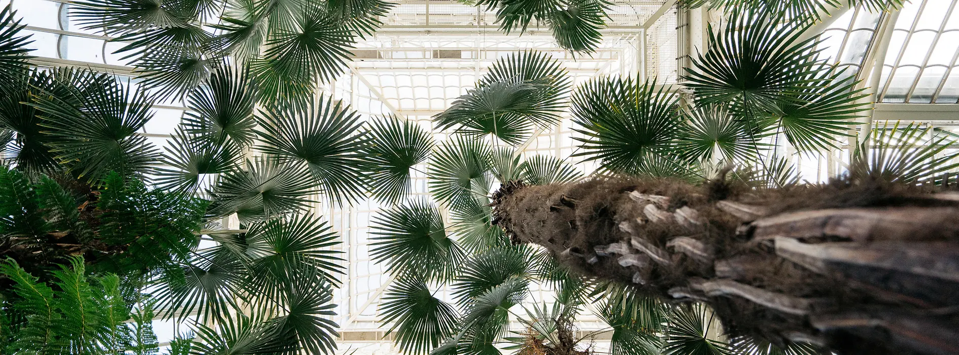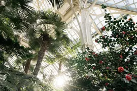 The Palm House is divided into three pavilions and three climate zones, which are connected to each other by tunnel-like corridors. The tallest room exhibits plants from the Mediterranean region, the Canary Islands, South Africa, America and Australia. The northern room houses plants from China, Japan, the Himalayas and New Zealand. Tropical and subtropical plants grow in the third area. Temperatures range between 8 and 17 degrees Celsius.