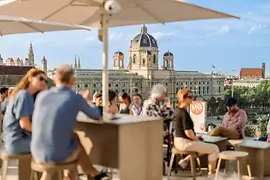 The MQ Libelle viewing terrace sits atop the Leopold Museum in the MuseumsQuartier. There, the Zur Libelle rooftop bar offers guests a variety of negronis, cocktails, wines, light snacks and, of course, a fantastic view.