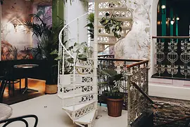 An eye-catcher is the covered atrium at the rear. Standing here is a wonderful spiral staircase that used to lead down into the cellar of the Adlerhof and now looks like a large hanging basket. And old balustrade by Otto Wagner, the "paradisaical" fresco of the Austrian Rococo painter Johann Bergl printed on wallpaper, as well as a whole bunch of vintage lamps – one hardly knows where to look. And right at the back, the salon in green.