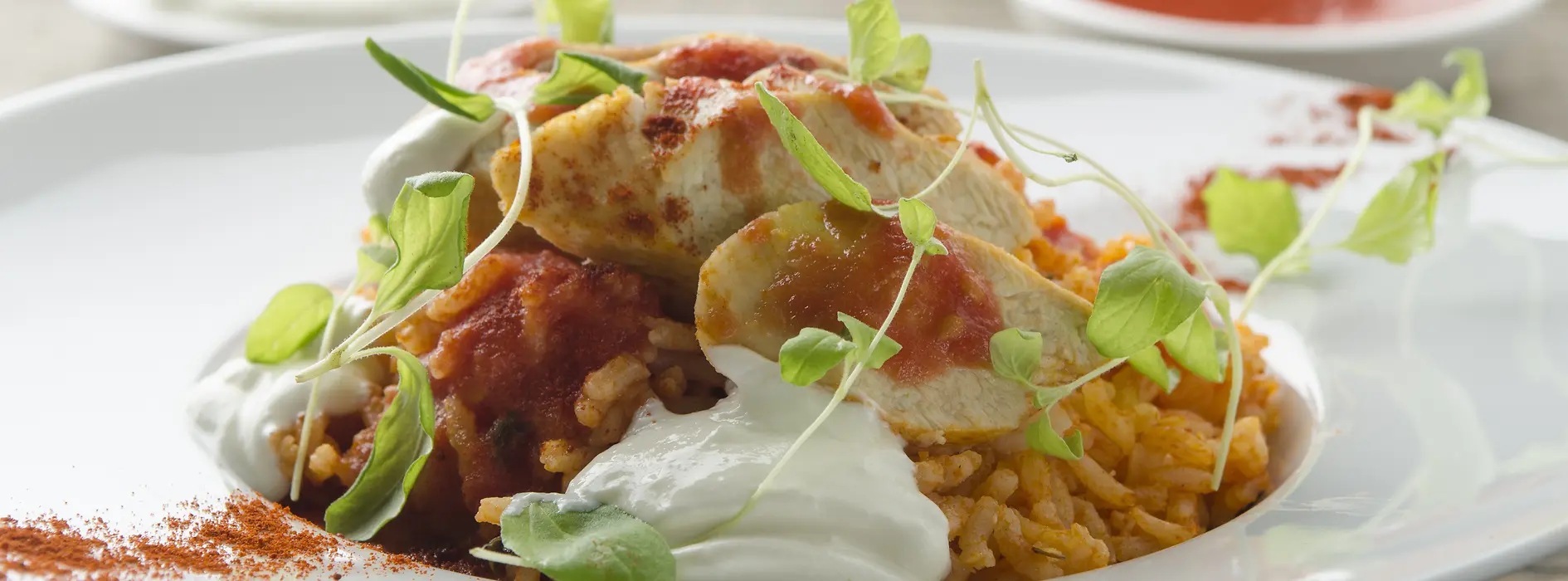 Serve the meat with the rice on warmed, deep plates. Briefly sauté the peppers in olive oil and place on the plates. Decorate with marjoram or thyme and pour over the sauce.
