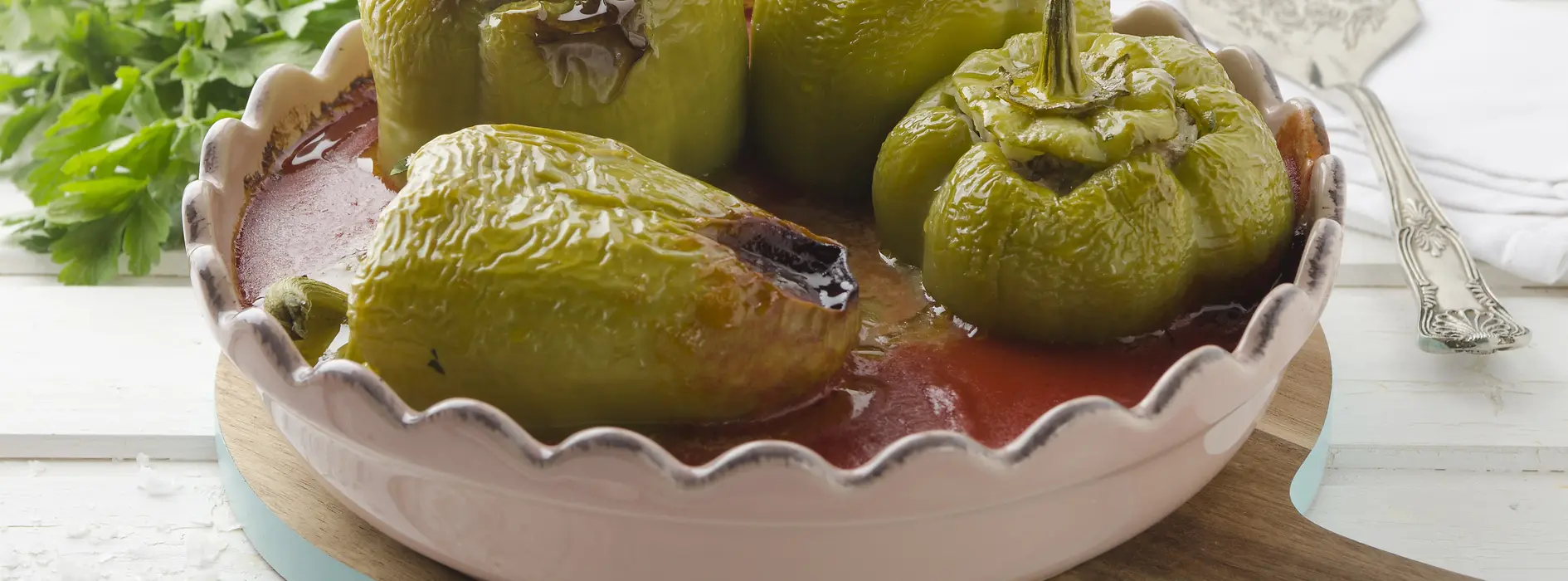 Cut out a lid at the stalk end of the washed peppers. Remove the seeds and white pith, and wash the inside of the peppers. Allow to drain. Finely chop the onion and fry in a little butter until a pale golden color. Chop the parsley finely and stir in. Mix the onions into the minced meat, add the egg, and season with salt, pepper, and nutmeg. Mix in the cooked rice. Fill the peppers with the mixture and close with the lid inserted upside down. Melt a little butter and sear the pepper skins all over in it. Place in a heatproof mold together with the butter and pour on the prepared tomato sauce. Cook in a pre-heated oven for about 45 minutes at 160 °C (320 °F). Turn the pepper skins regularly.