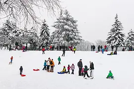 If you're looking for an activity for the whole family, why not try tobogganing? There are plenty of smaller hills in Vienna's parks – on the Jesuit Meadow in the Prater, for example. The Dollwiese in Hietzing even has a 100 meter-long conveyor belt to ferry all the winter sports fans uphill. Alongside the tobogganers, young skiers also have their first experiences on two boards.