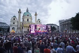 Guiding system for the visually impaired with special "leading stones" (grooves and knobs), which can be felt with canes or feet - for the passage between the individual artistic institutions on Karlsplatz (e.g. Künstlerhaus, Musikverein) and for crossing the Friedrichstrasse-Lothringerstrasse intersection (which has heavy traffic), the traffic lights have audible signals.