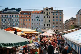 There is the lively Karmelitermarkt, for instance, with its exciting Jewish history. Or the Spittelberg, with its uneven cobblestones just next to Vienna’s cultural hotspot, the MuseumsQuartier Not forgetting gourmet streets such as Servitengasse in the French-inspired Servitenviertel or the Schleifmühlgasse in the Freihausviertel. The Gußhausviertel with the social hotspot that is Karlsplatz and the Wien Museum. The Stuwerviertel, located close to the Prater. Markets that could not be more different: the bourgeois Kutschkermarkt, the long, multicultural Brunnenmarkt or the Meidlinger Markt, which is still unfamiliar to many. And districts that are still coming into being, such as Seestadt, the Sonnwendviertel and the Nordbahnviertel.