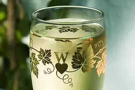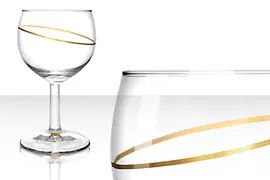 For the glasses, the graphic designers make reference to old heuriger traditions. Wine used to be commonly served in bulbous stemless glasses, whose edge was decorated with a green vine pattern. On the glasses in the "Das goldene Wiener Herz" range, these vine patterns are now finished in real gold. Also attractive is the balloon glass with the "tipsy" gold edge and a small heart on the bottom. The "ballon" used to be the most commonly found wine glass in Vienna's inns and is increasingly disappearing from everyday life.