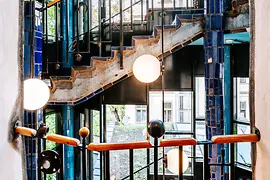 On the ground floor of the Kunst Haus is the foyer and museum store, which was extended during the renovation. It is also where visitors will find Café Friedlich, a jungle-like culinary oasis serving meaty classics of Viennese cuisine as well as vegetarian delights. Tuck into a Wiener Schnitzel or Hundertwasser’s favorite dish: nettle soup.