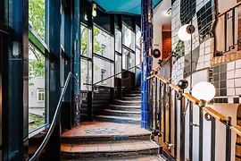 Architectural master Hundertwasser is celebrated as a visionary artist and designer on each of the building’s four floors. The first two floors comprise an exhibition of Hundertwasser’s oeuvre (the only permanent Hundertwasser exhibition in the world), which includes around 170 of his works. In addition to numerous paintings, prints, tapestries and woodcuts, the exhibition also presents numerous objects that underline Hundertwasser’s philosophy: a “humus toilet” that produces raw materials, a plant-based sewage treatment system as well as models of the Spittelau waste incineration plant that he designed and his hillside meadowland. The third and fourth floors of the museum are dedicated to temporary exhibitions of exciting contemporary art.