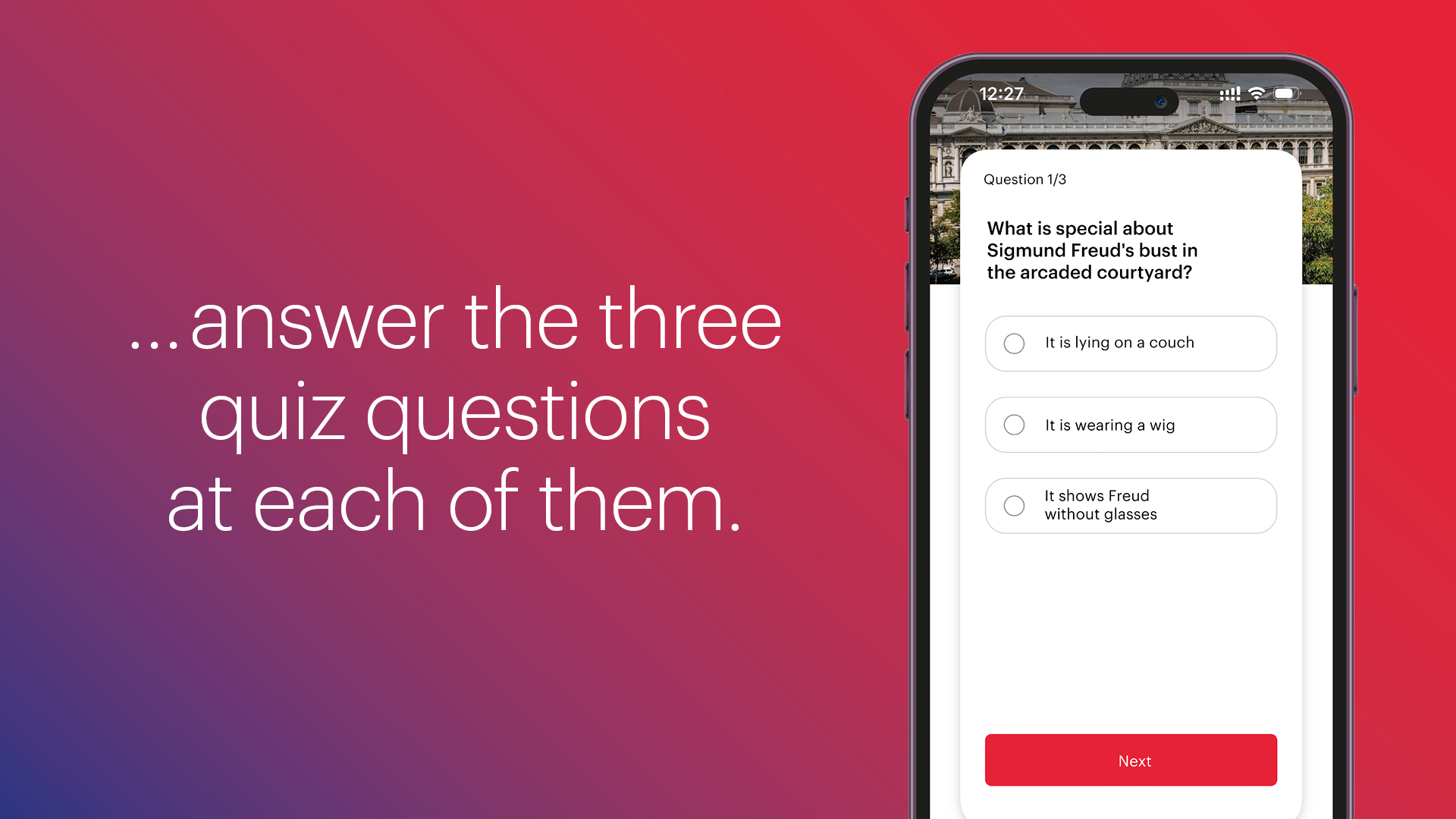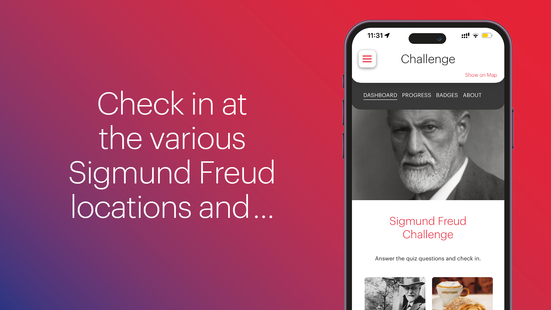 The challenge involves visiting special places in Vienna that played an important role in the life and work of Sigmund Freud. This is how it works: In order to score points for the challenge, you have to check-in digitally at 6 locations across Vienna with your smartphone and correctly answer 3 quiz questions for each location.