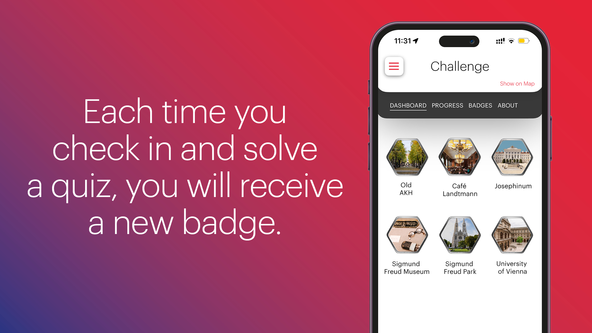 You can achieve this by answering all the quiz questions (3 questions per location) correctly and checking in at all 6 of the Sigmund Freud locations in the ivie challenge – the digital check-in will work within a distance of 100 meters of the location.