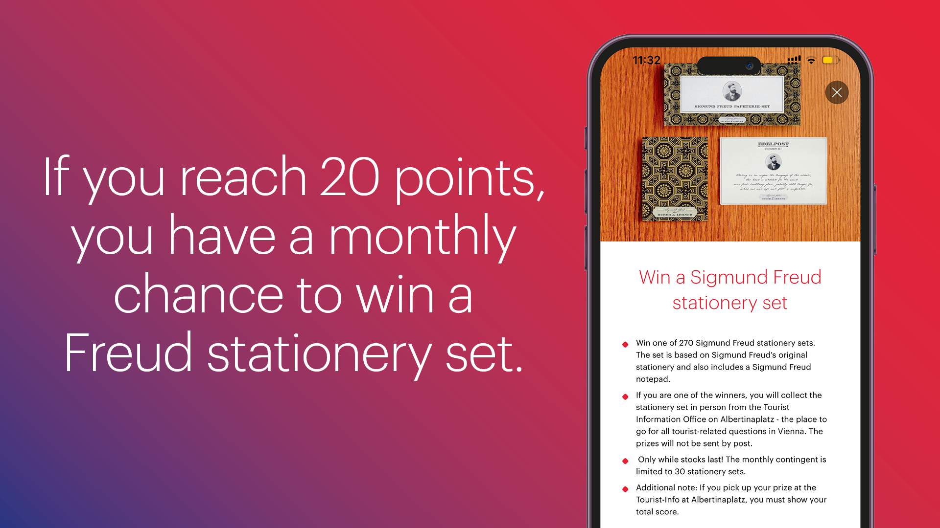 - You will need to collect your stationary set from the Tourist Information Albertinaplatz (Albertinaplatz 1, 1010 Vienna) and show your points score in the ivie app to the staff there. Please be aware that the stationary sets are limited in number! 30 Sigmund Freud stationery sets will be raffled off each month.