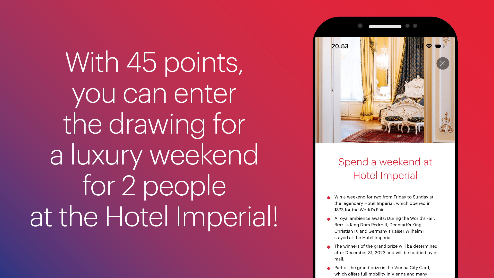 To qualify for the draw for the main prize (a luxury weekend in Vienna for two people at the Hotel Stefanie from Friday to Sunday), you need a maximum score of 30 points.