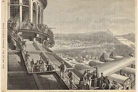 Exactamente 206.270 personas pudieron contemplar las vistas de Viena desde el tejado de la Rotonda. Allí se habían instalado grandes telescopios. Pagando entrada, se podía subir por unas escaleras; más tarde se pudo utilizar un ascensor hidráulico colocado en el interior de una de las columnas férreas. | Wien Museum: Exposición Universal de 1873