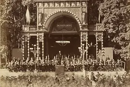 Johann Strauss (hijo) lo había conseguido: actuar en exclusiva en el recinto con su conjunto musical. La acústica de la Rotonda, sin embargo, no era muy buena; el pabellón musical erigido con prisas al respecto tampoco tuvo mucho éxito, ya que solo la orquesta estaba a cubierto, los precios de las entradas eran elevados y Strauss casi nunca dirigía. Pero Strauss consiguió ganarse de nuevo la opinión pública mediante conciertos realizados fuera del recinto. | Wien Museum: Exposición Universal de 1873