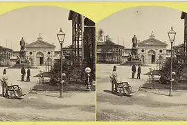 Algo muy curioso fueron los 500 carritos con ruedas producidos por la empresa Fischer & Meyer que servían para desplazarse por el recinto y que podían ser alquilados pagando y eran dirigidos por guías elegantemente vestidos de librea. También la Corte imperial mandó construir algunos para su propio uso. En la imagen puede verse una fotografía estereoscópica, algo muy moderno en la época que creaba una imagen tridimensional utilizando un estereoscopio. | Wien Museum: Exposición Universal de 1873