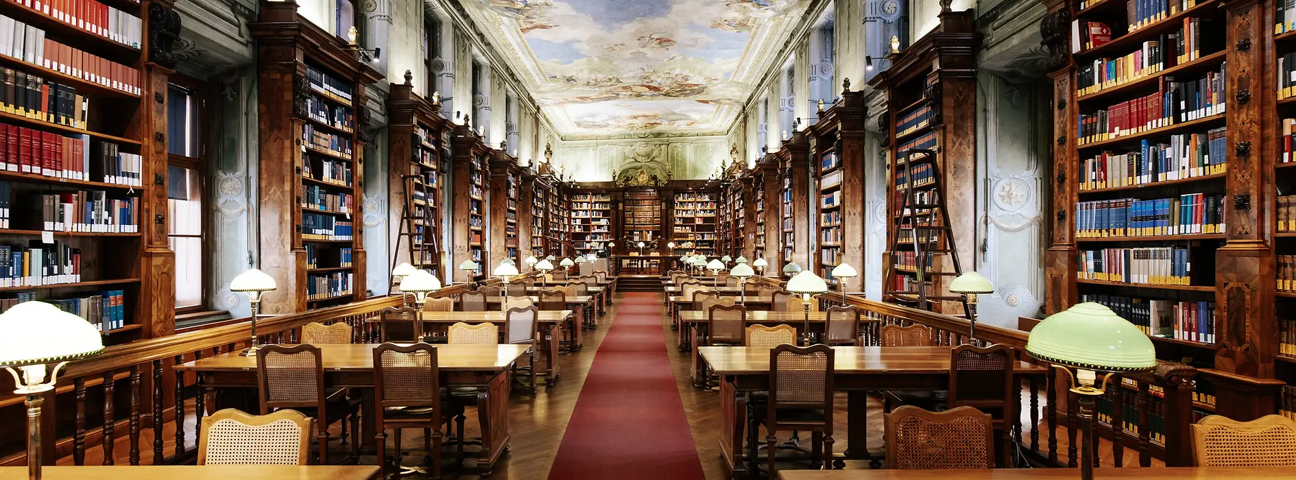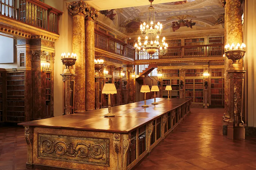 Con siete salas de lectura y alrededor de 3,9 millones de libros, la Biblioteca Nacional de Austria, situada en el Hofburg, ocupa el primer puesto de la lista, sobre todo por su esplendorosa sala. El impresionante edificio fue construido por Johann Bernhard Fischer von Erlach y su hijo Joseph Emanuel. Construida en el siglo XVIII en estilo barroco, la sala impresiona por su cúpula profusamente decorada y sus espléndidos globos terráqueos venecianos, y está adornada con más de 200 000 volúmenes históricos. Sin duda, un lugar deslumbrante. La tarea más importante de la biblioteca es recopilar y archivar todas las publicaciones que aparecen en Austria, incluidos los medios electrónicos. La valiosa colección de libros de la Biblioteca Nacional incluye, entre otros, libros de las colecciones de los Habsburgo. Esto la convierte en una de las bibliotecas históricas más importantes del mundo.