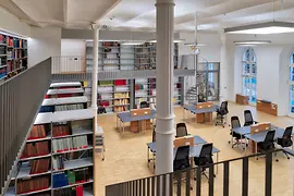 ¿Cómo funciona la vibración del cordaje que genera el sonido de un contrabajo? Y, ¿cuáles son las diferencias que hay entre un pasticcio y una ópera bufa? Preguntas como estas encuentran respuesta en la biblioteca de la Universidad de Música y Artes Escénicas, y además lo hacen en una sala espectacular de la biblioteca, en un entorno de fachadas de cristal y columnas históricas.