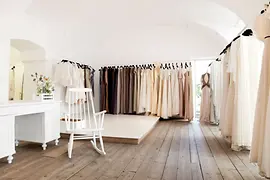 La diseñadora es conocida por sus cortes esculturales y sencillos. Produce de forma sostenible y en su tienda también se pueden comprar vestidos de novia.