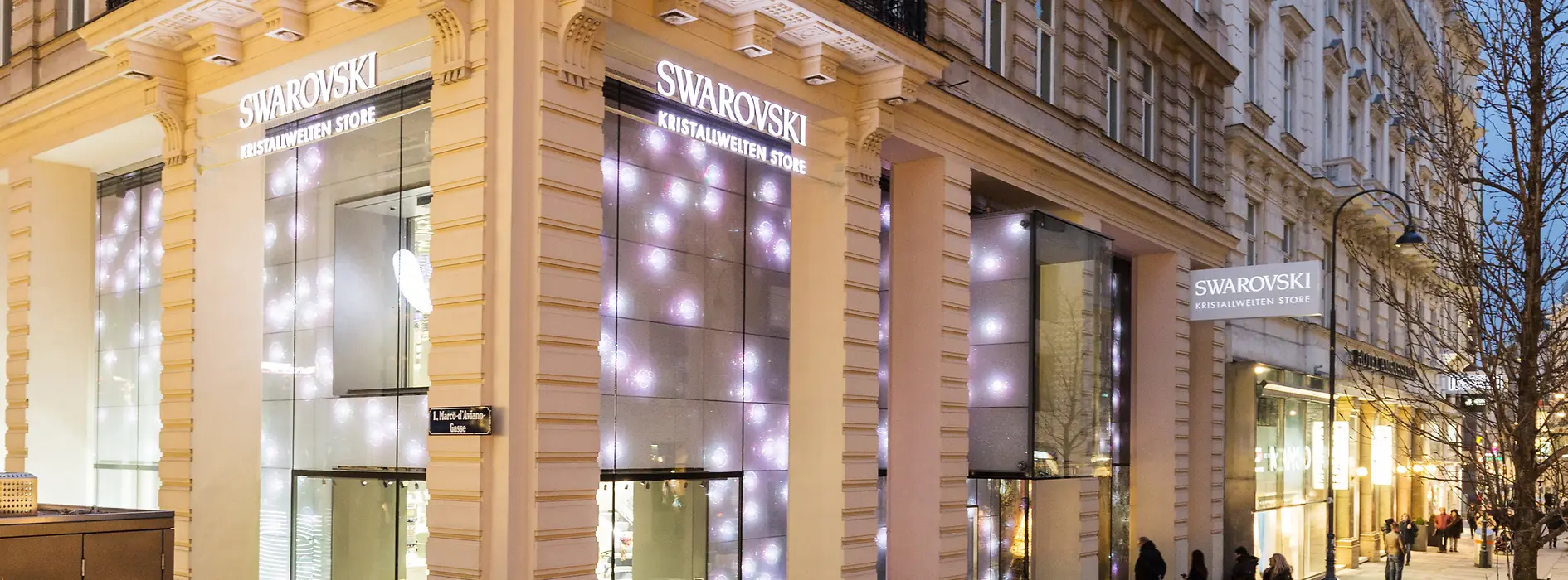 Le Swarovski Kristallwelten Store Vienne ne brille toutefois pas uniquement par ses fabuleux produits. Illuminée par des modules lumineux en cristal sertis de diodes, la façade spectaculaire du bâtiment brille de mille feux dans cette rue commerçante de Vienne. Des installations réalisées par des artistes de renom sont à admirer dans des cubes de verre débordant sur la rue. Le même concept est de mise à l'intérieur où des installations jouant avec la lumière, le verre et les miroirs attirent tous les regards.