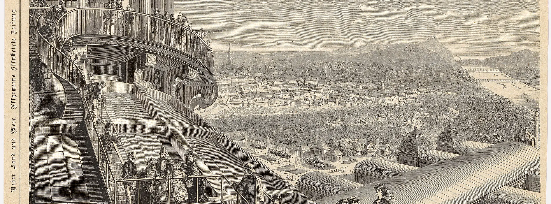 On a compté exactement 206 270 visiteurs qui ont pu admirer le panorama de Vienne depuis le toit de la Rotonde, où de grands télescopes avaient été installés. Quiconque avait payé l'entrée pouvaient emprunter l'escalier, puis un ascenseur hydraulique qui parcourait l’intérieur d'une des colonnes de fer. | Wien Museum : Exposition universelle de 1873
