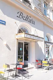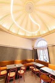Le café Bellaria, l'un des plus anciens cafés de Vienne, est un lieu de légende. Situé en second rideau derrière le boulevard du Ring, il n'avait certes pas le faste de la Ringstrasse mais son public n'en était que plus excentrique. Heureusement, le café a été repris par deux restaurateurs à succès lors du départ à la retraite de l'ancien exploitant, et non par une chaîne de fast food. La rénovation est plus que réussie avec une déco intérieure signée KLK, un cabinet d'architectes viennois. La spectaculaire coupole est toujours là et mise en valeur par une installation de néons. Les chaises Thonet rouge vif, les banquettes orange et les lamelles en ardoise grise forment un contraste saisissant.