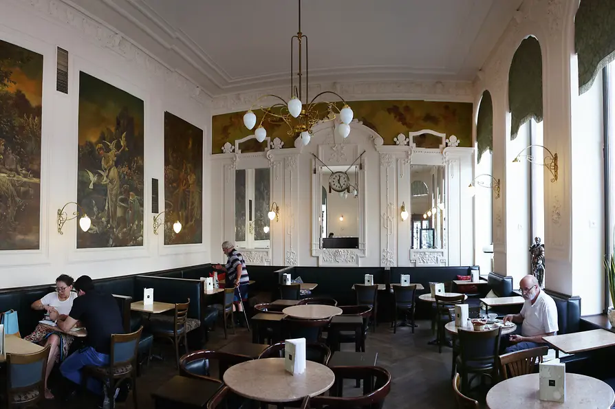 Ce magnifique café historique n’est pas fréquenté uniquement par les gays. Elles sautent aux yeux, dès qu’on entre : les immenses glaces sont les plus grandes d’Europe – après celles de Versailles.