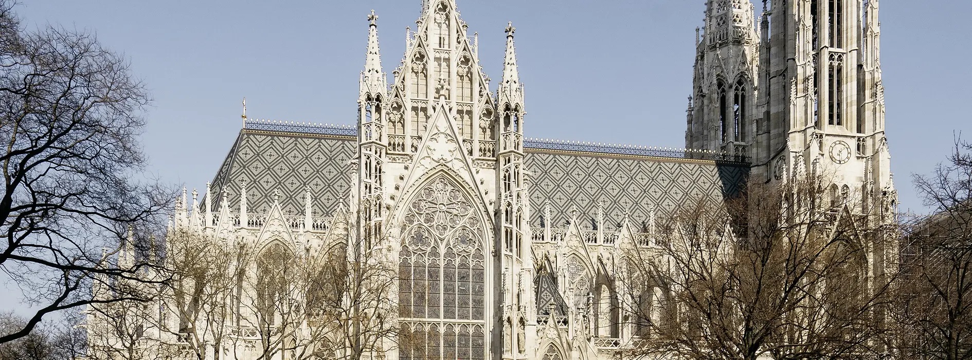 A francia katedrálisok mintáját követő háromhajós újgótikus bazilika az európai historizmus legjelentősebb építményei közé tartozik. Mivel a Ringstraßen áll, a Votivkirchét „Ringstraßendom”-nak is szokták nevezni. A két tornya félreismerhetetlen. Befejezésükhöz hajdanában a bécsi városi tanács 150.000 Gulden arany pénzérmével járult hozzá. A Bécsi Egyetem főépületének közvetlen közelében emelkedő szakrális épület nem csak impozáns méretei miatt nem kerüli el figyelmünket: 99 méteres magasságával a Votivkirche a Stephansdom után Bécs második legmagasabb temploma. Közismert a 78 üvegmozaikos ablaka is, amelyeken az 1970-es években végzett restaurálás után immár modern motívumok is láthatók.