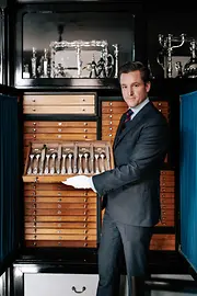 L’azienda a conduzione familiare Jarosinski & Vaugoin è una delle più antiche argenterie ancora esistenti al mondo che produce oggetti in argento battuto a mano. In un laboratorio storico del 7° vengono realizzati a mano raffinati oggetti in argento, che vengono consegnati persino alla famiglia reale nel Kensington Palace di Londra, ma anche alle più remote case reali dell’Arabia e della Malesia. La manifattura d’argento è specializzata in posate da tavola e cultura gastronomica, dal barocco al design contemporaneo. L’ampio assortimento di posate in argento comprende 200 diversi modelli. Il padrone di casa Jean-Paul Vaugoin ama raccontare storie su questi oggetti e su altri pezzi di posateria particolarmente insoliti. Infatti, esiste una posata per quasi ogni esigenza: dal cucchiaio da pompelmo alla forchetta per ostriche, fino al supporto d’argento per cosce di pollo. Se volete sapere come apparecchiare una tavola in modo impeccabile, Jean-Paul Vaugoin è un esperto anche in questo. E viene spesso consultato proprio per questo.