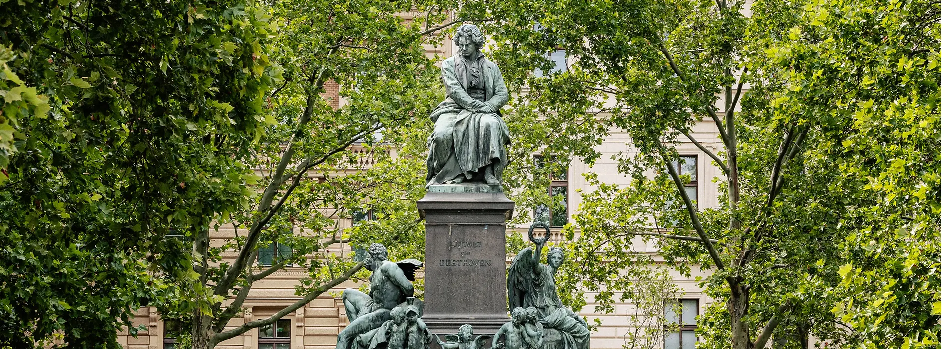 La statua in bronzo del 1880 mostra Beethoven seduto, con ai piedi un Prometeo e un angelo incatenati.