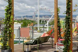Sul tetto dell'Hotel Zoku, il Kindred Spirits Rooftop Bar offre una vista a 360 gradi su Vienna e sul Prater. Di sera, le attrazioni del Wurstelprater di Vienna creano un mare di luci colorate e tanta atmosfera. E si può anche mangiare.