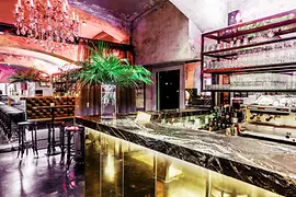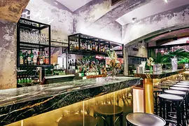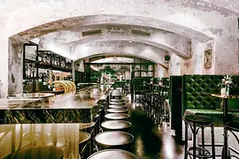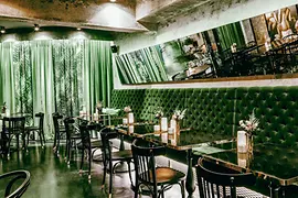 L’accesso dalla poco appariscente porta metallica svela un ristorante di alta gastronomia dal raffinato design, oltre a un’invitante zona bar. Il fascino dello stile industriale delle pareti al grezzo si abbina al verde intenso delle comode sedute imbottite, creando un interessante contrasto.