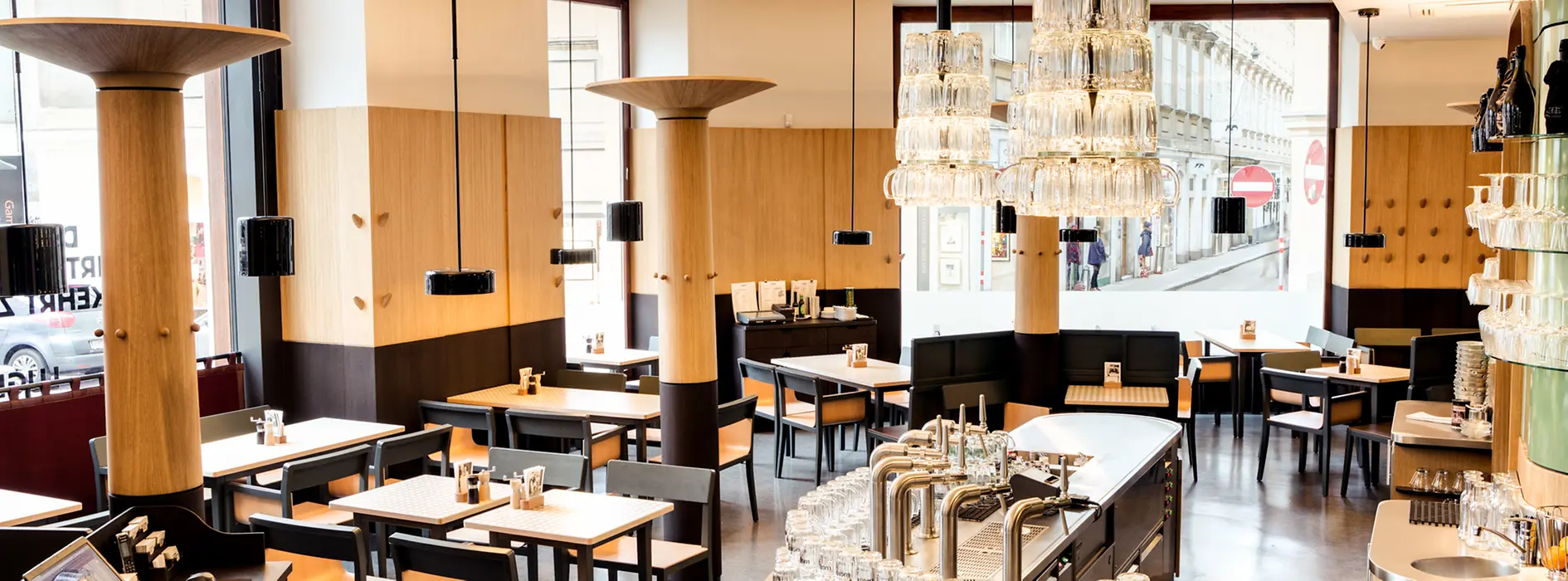 ルゲックはウィーンの食文化を現代的なフォルムに包み、若い人たちにも好評です。建築家グレゴール・アイヒンガーは、ウィーンの伝統的なレストランを「今」に翻訳しています。ここでは典型的なウィーン料理が最高度に洗練され、独特のプラスアルファとともに供されます。